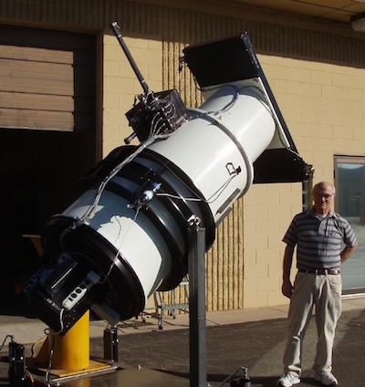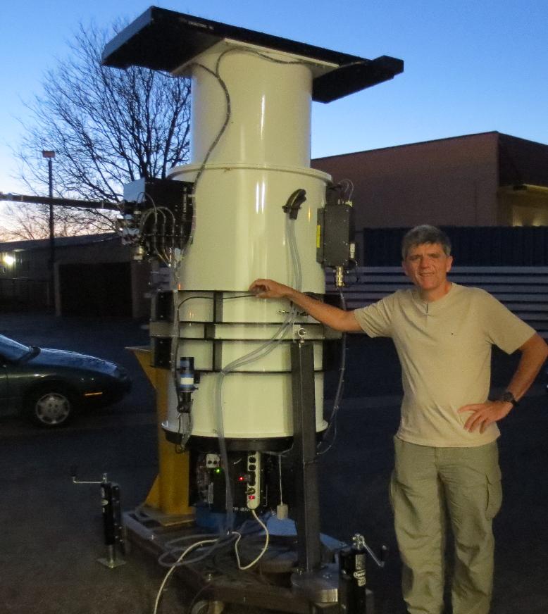 Dr. Frank Melsheimer, founder of DFM Engineering with ATLAS 1. The shutter assembly is at the top end of the tube; the box with the protruding rod on the side of the telescope is the filter changer