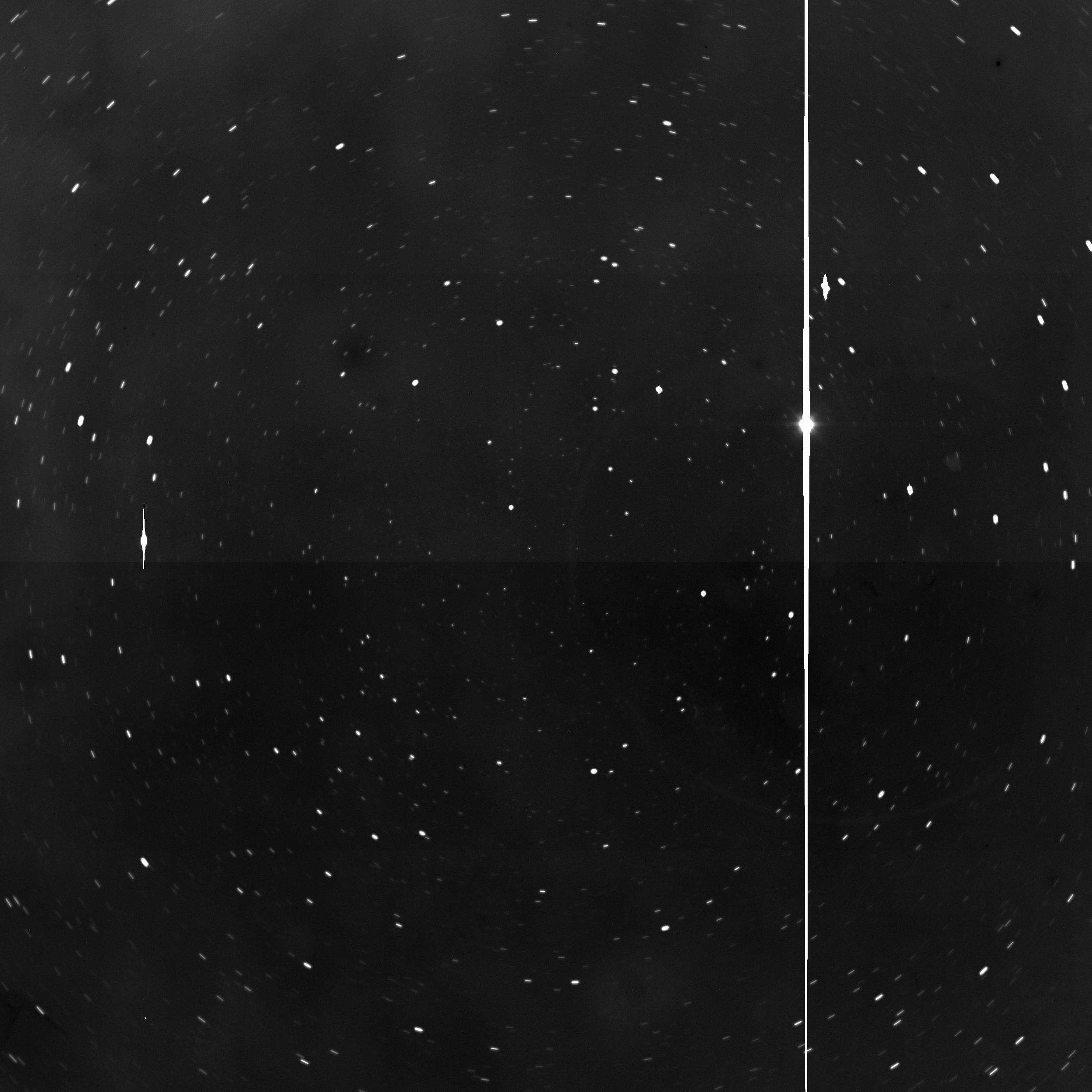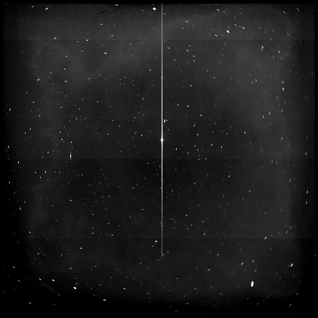 On the right is a 200-second raw image of the north celestial pole with no background subtraction or flatfield correction. Stars near the edges of the picture show the effect of the rotation of the sky, since the telescope was not attached to a tracking mount in these tests. The vertical streak is the star Polaris, which is over-exposed.