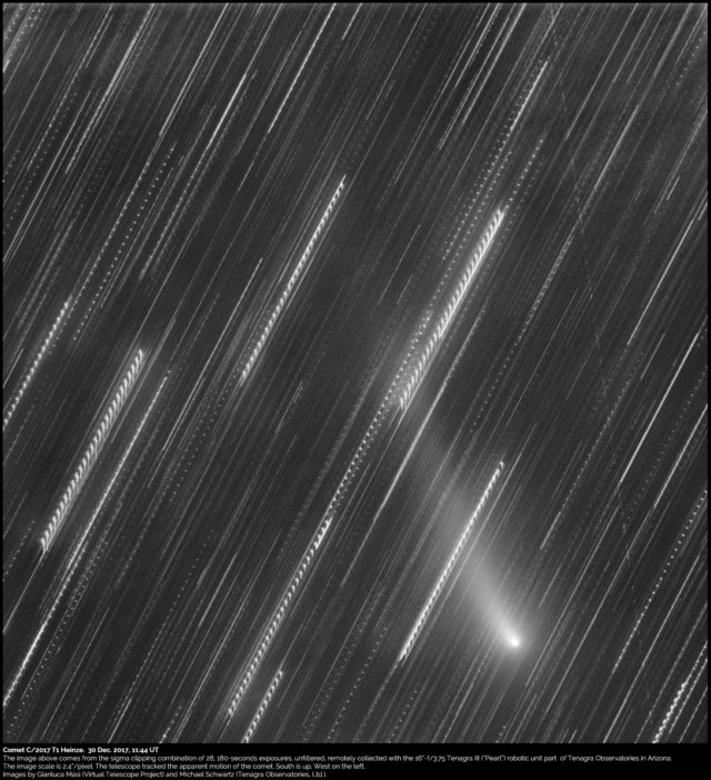ATLAS so far has discovered nine comets. The most spectacular of these is Comet Heinze, which is named after our own Ari Heinze. The comet reached perihelion on 21 February. For more information see this Sky and Telescope article. The image on the right was obtained remotely by Tenagra Observatory in Arizona